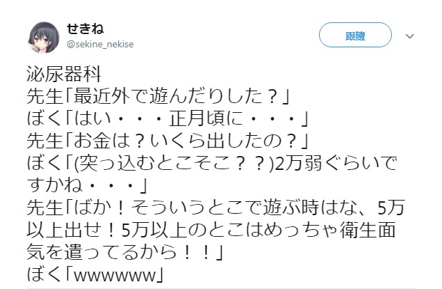 日本網友「せきね」在推特PO文表示,他自認因買春感染了淋病,主動前往泌尿科看診,並向醫生坦承年初的連續假期有去買春。對此,醫師接著詢問,「是找價位多少的?」他老實地回答,「2萬日圓(約新台幣5800元)」,不料醫師接下來說的話讓他聽了當場目瞪口呆,「要去買春時,至少要找5萬日圓以上,因為她們很重視衛生」,醫生不僅當場吐槽男子,更直罵他「笨蛋!」