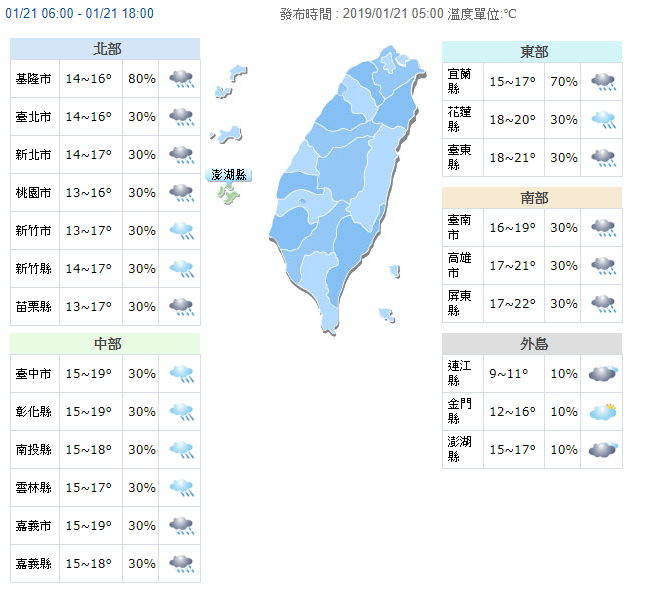 氣溫方面,今天全台偏濕冷,北部低溫15度、中部低溫17度、東部低溫18度、南部低溫17度。北部、中部、東部高溫各地高溫約17至20度,南部高溫23度,早晚溫差大,紫外線指數為低量至中量級。