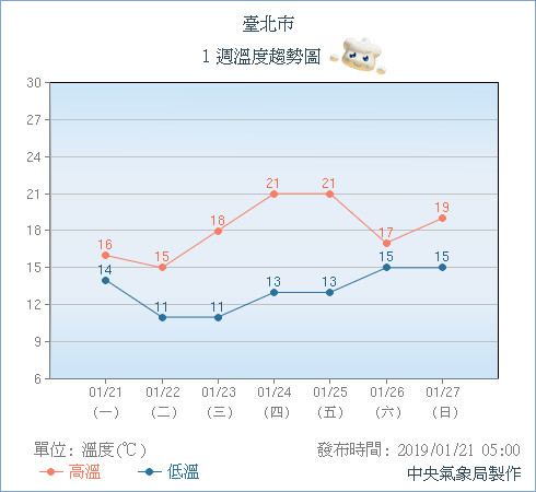 強烈大陸冷氣團威力最強的時間落在週二(22日)晚間至週三(23日)清晨,局部地區僅11度;受輻射冷卻效應影響,空曠地區不排除將下探10度甚至9度低溫。屆時北部及東半部不到20度,整天較冷,中南部約24度上下;南部及花東低溫也只有14至16度。