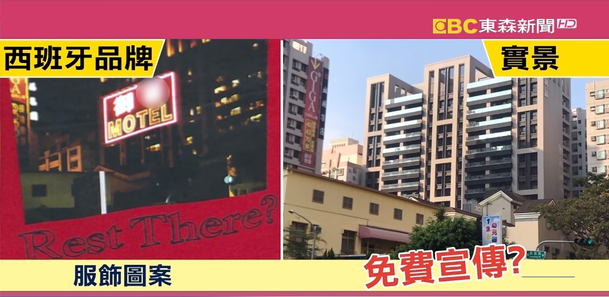 高雄知名摩鐵的招牌,竟然被印在西班牙品牌服飾當成圖案,這個品牌在全世界銷售,簡直是最好的免費廣告,業者說,他去年底在巴黎逛街就看到,當時立刻買了一件,回台後,看到同款全買了,要當成員工制服外,還說只要客人穿同款T恤來消費,就享有7折優惠。
