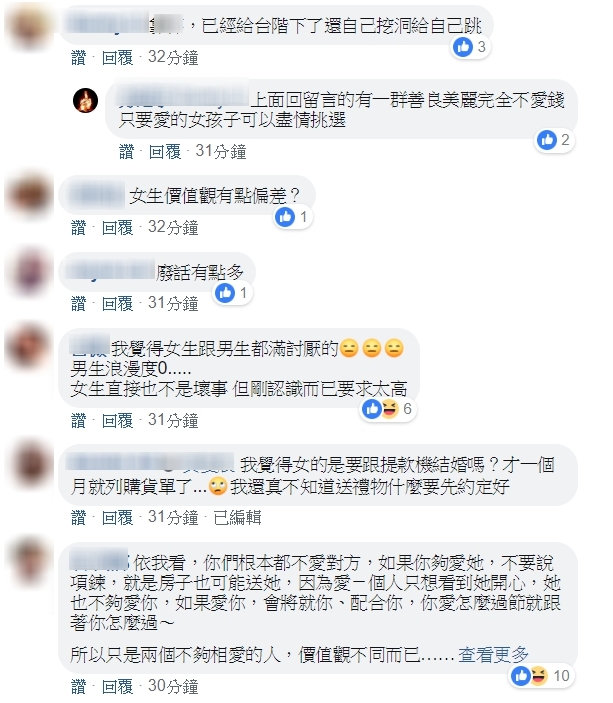 不過,也有許多網友認為男方也有問題:「你們2個確實不適合在一起,一開頭就話不投機了,雞同鴨講的,你根本沒在聽人家想跟你說什麼」、「我覺得送禮必要的,如果這點小錢都沒辦法花的話就要找個吃貨女友囉」、「就對話記錄看來我反倒覺得女方EQ很好,是你先入為主的觀念把她妖魔化了」、「每個人喜歡的不同吧~你問她想要什麼,還把她妖魔化」、「看到對話,不管彼此價值觀差異有多大,愛問又打臉人家,光是男生『碎碎唸、談道理』這點,就註定繼續往魯蛇之路前進吧」、「你愛問又要打臉對方,這樣對彼此都不是很好吧」。