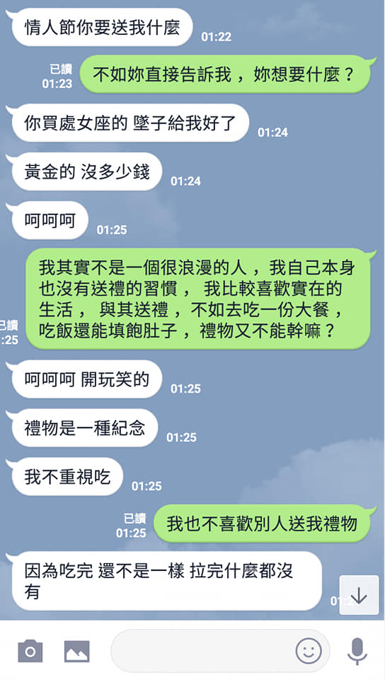原Po在臉書社團《爆廢公社二館》分享多張聊天截圖,從照片上可以看到,女方以情人節為由要求原Po送自己一條金項鍊,但原Po回應,與其送禮物,不如去吃大餐還能填飽肚子,而女方則說自己不重視吃,因為拉完就什麼都沒了,禮物至少還能做紀念。