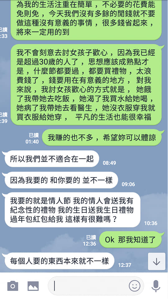 接著原Po說,就算要送禮也要送實用的,且自己沒有過節的習慣,日子簡單過就好,能省則省,同時向女方強調,生活注重簡單,不必要的花費能免就免,把錢省起來,以後一定用得到,且他都超過30歲了,思想比較成熟,不會刻意去討女生歡心,只要他的另一半餓了有得吃、渴了有得喝就好,平凡的生活也能很幸福。