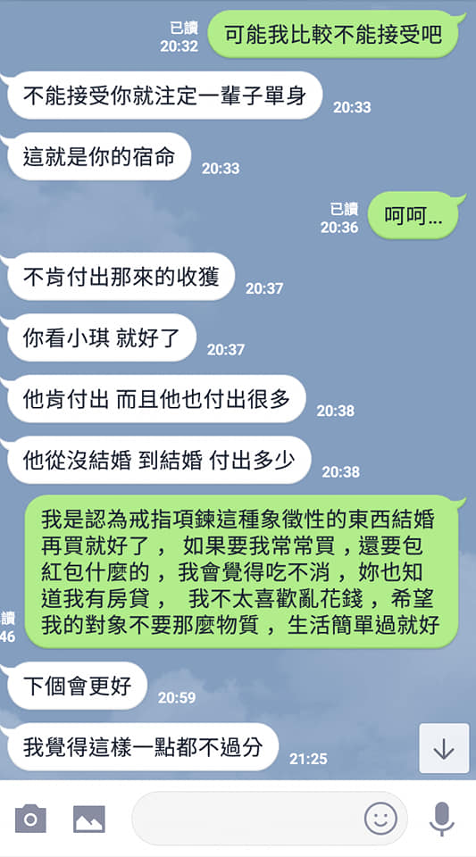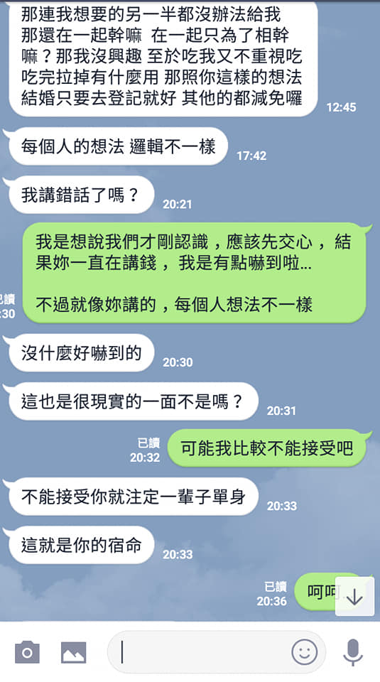 不過,對於原Po的說法,女方不認同,並表示「我們不適合在一起」,因為兩人要的東西不同,而原Po則說,剛認識應該先交心,女方一直講錢的事會嚇到他,而女方認為這是很現實的一面,沒什麼好驚訝的,更嗆原Po「不能接受你就注定一輩子單身,這就是你的宿命」!