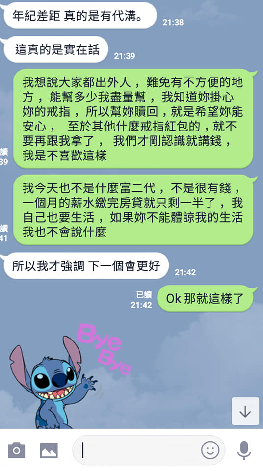 最後女方丟出「下一個會更好」,原Po則說:「我自己也要生活,如果你不能體諒我的生活,我也不會說什麼。」兩人不歡而散。