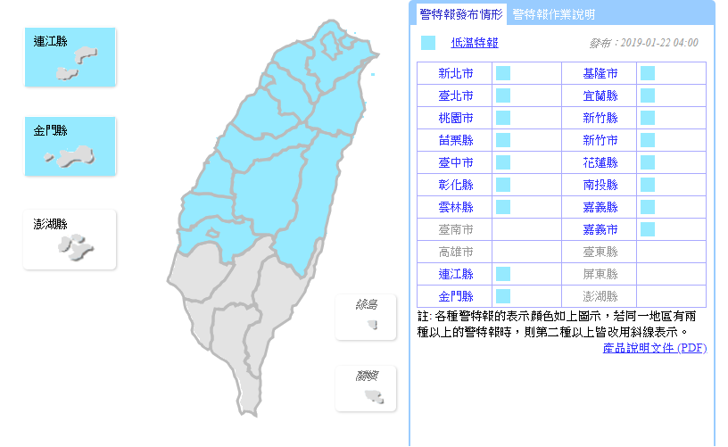 氣象局也對17縣市發布低溫特報,包括:新北市、基隆市、台北市、宜蘭縣、桃園市、新竹縣、苗栗縣、新竹市、台中市、花蓮縣、彰化縣、南投縣、雲林縣、嘉義縣、嘉義市、連江縣與金門縣。呼籲農漁養殖業及山坡地作物請嚴防寒害,民眾使用瓦斯熱水器請注意室內通風,以免一氧化碳中毒、使用電暖器具亦請注意用電安全。