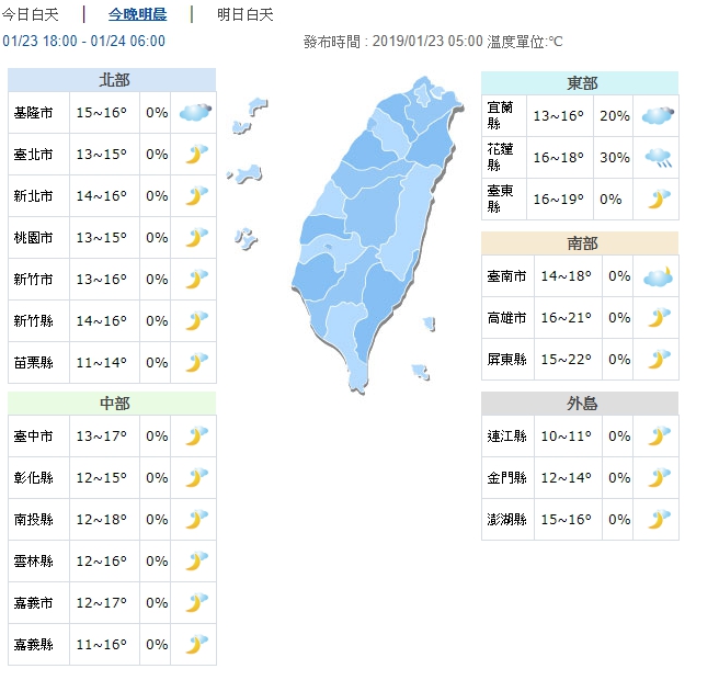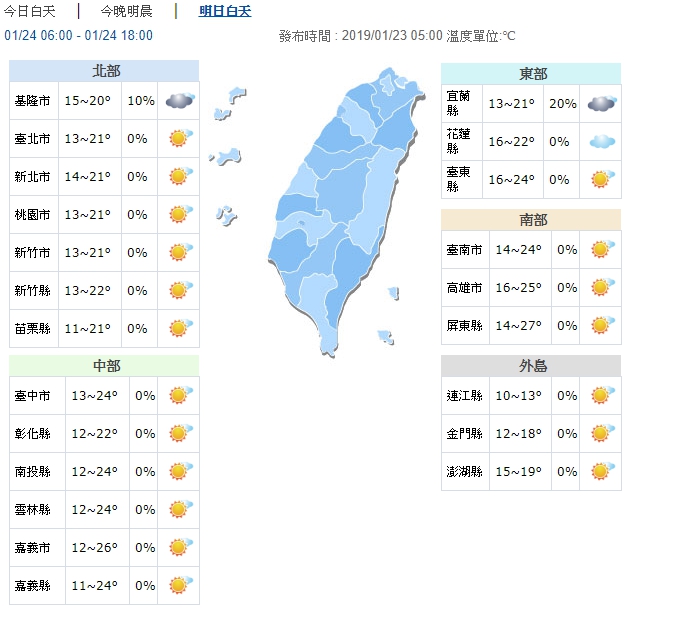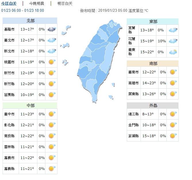 中央氣象局指出,在氣溫方面,23日白天持續受冷氣團影響,北台灣及宜蘭整天氣溫持續偏冷,高溫不超過20度,中部及東南部高溫約23度,南部則有機會來到26度。由於水氣少,各地大多為多雲時晴的天氣,僅東半部地區有些零星短暫雨。