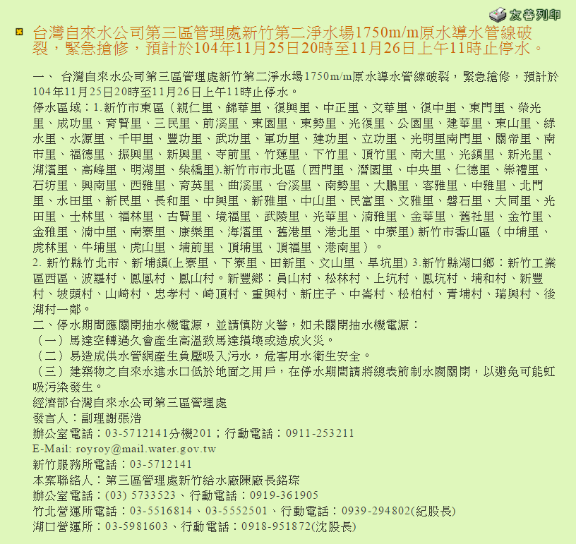 台灣自來水公司第三區管理處新竹第二淨水場1750m/m原水導水管線破裂,緊急搶修,預計於104年11月25日20時至11月26日上午11時止停水。