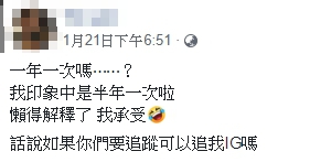 德德則在臉書PO文回應,「一年一次嗎?我印象中是半年一次啦!懶得解釋了,我承受」德德對於陳年往事被重提,語氣似乎相當無奈。還有友人為德德打抱不平,留言表示「我好想去留言女的跟人跑了」、「突然就有小孩、跟人結婚了」,而德德則回應,「這也只有認識我的人才會相信吧!跑了也好,其實她真的不是我的菜」。