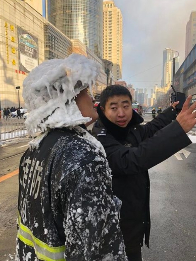 綜合陸媒報導,去(2018)年12月8日,一名消防支隊隊長岳永峰,帶著整隊的消防員到大連附近的老式建築救火,當時的天氣十分寒冷,到處都一片白雪皚皚,由於拿著水槍撲滅大火,水都濺到身上,導致他身上都結了一塊塊的冰霜,當下因為情況緊急,岳永峰完全沒有發現雪已經讓他變得跟「雪人」一樣,他還是透過同事的提醒,才驚覺自己已經被皚皚白雪覆蓋。