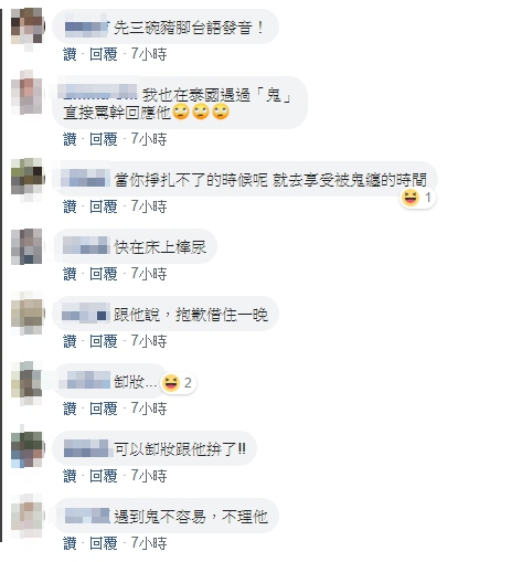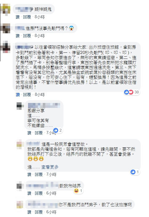 一位網友則說,罵髒話是錯誤的觀念,「人都該互相尊重,更何況祂也曾是人,除非犯你,否則不能罵,更不能放佛經,那是讓祂們集合過來」。另外,具有領隊經驗的網友提出3點建議,「停留20秒先敲門(叩丶叩丶叩)」、「進了房門插了卡,别急著整理行李,東西放著先去廁所把水龍頭打開流水,馬桶多按壓幾次,這意謂壞東西通通流走」、檢查「床下看看有没有其它物品…若有,趕緊換房!因為這房之前肯定出過事」。