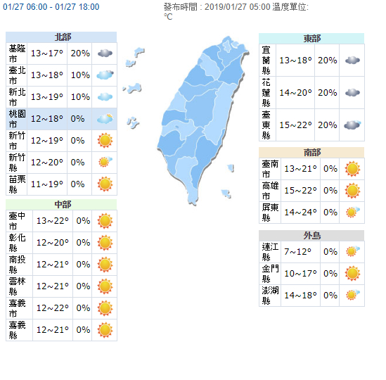 中央氣象局表示,強烈大陸冷氣團影響,今(27)日北台灣整天偏涼冷,中南部日夜溫差較大;這波冷氣團水氣偏少,僅東半部地區及北部山區有局部短暫雨,其他地區大致為多雲到晴的天氣。