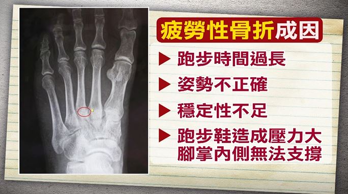 天主教聖馬爾定醫院經骨科主任裴有成:「那這個病人他沒有,任何的扭到受傷的病例,只是說他參加了幾次的路跑,幾個月來腳痛還是繼續跑,那我們懷疑這是行軍性骨折。」