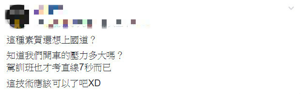 網友在臉書《爆怨公社》PO出一張照片,透過畫面可見,一名騎士不知道什麼原因,行駛在高架化鐵軌,道路的空間剛好只容許一輛機車,旁邊就是火車鐵軌,騎士只能直直往前騎,完全沒有後退的空間。看到照片後,他心生不滿:「這種素質還想上國道?」坦言因為這類騎士的素質,導致他們汽車駕駛上路心驚驚,「知道我們開車的壓力多大嗎?」不過,他也幽默表示,機車駕照考試最難的關卡莫過於「直線7秒」,笑稱「這技術應該可以了吧XD」。