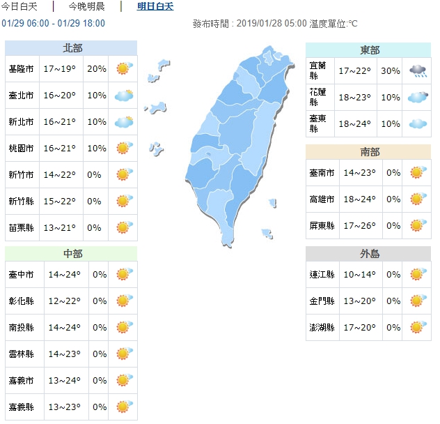 氣象局指出,彰化以北、宜蘭及金門、馬祖沿海、空曠地區均出現10度左右的低溫,白天起強烈大陸冷氣團稍減弱,各地氣溫逐漸回升,北部及宜花高溫約20至22度,中南部及台東約22至26度。另外,僅東半部及大台北地區有局部短暫雨,其他地區為多雲到晴。