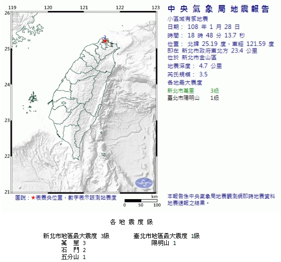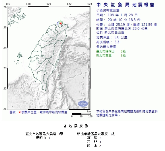 繼今(28)日晚間18時48分新北市金山區發生芮式規模3.5地震,最大震度新北市萬里3級,陽明山1級,晚間8時10分再發生有感地震,北台灣多個地區有感。根據中央氣象局地震報告指出,這起地震的震央位於新北市金山區,芮氏規模3.3,地震深度5公里。最大震度位在台北市陽明山、新北市萬里,分別都是3級。