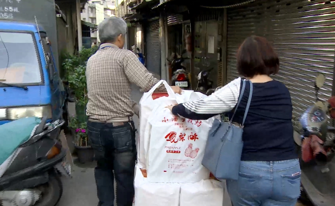 邊排隊邊交易,因為春節到了,鳳梨酥要送禮也要自己吃。還有這家公司,一個月前就下訂單買了100盒,要出動推車,兩個人一起扶著禮盒,才能扛回家。