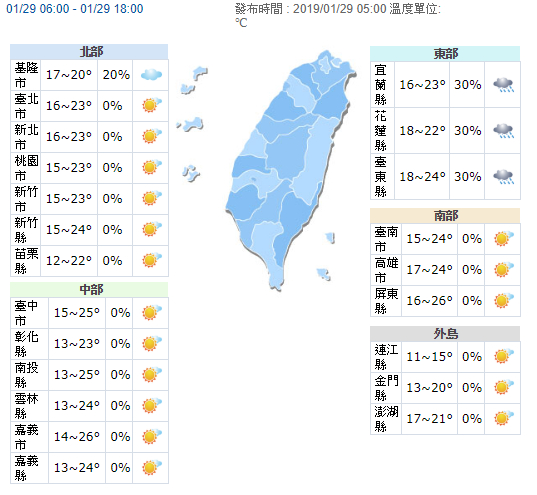 受到清晨輻射冷卻影響,今(29)日中部以北沿海、空曠地區低溫僅11至14度,白天各地陽光露臉、氣溫回升,預測北部及東半部高溫可以來到22至24度,中南部約25、26度,感受溫暖舒適,但入夜後氣溫將再度降低,請注意日夜溫差適時增減衣物。