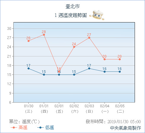 氣象局預估,這波好天氣持續到明(31)日,明晚開始東北風增強、氣溫下降,尤其北部及東北部降溫明顯,只剩下19、20度,中南部則影響不大,仍有23至26度的高溫好天氣,迎風面的北部及東半部地區有局部短暫雨,其他地區為多雲到晴的天氣,週五(2月1日)白天降雨機率高。