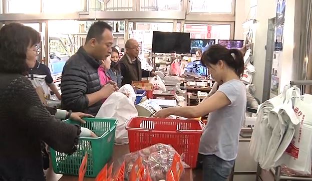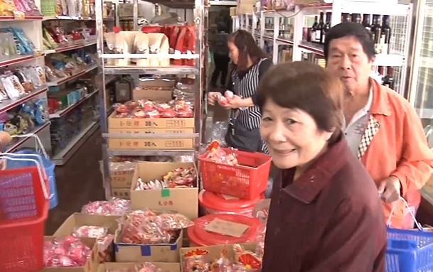 每個人提著籃子,餅乾、糖果拜拜用的壽桃等,好像都不用錢一樣,直往籃子裡放。
