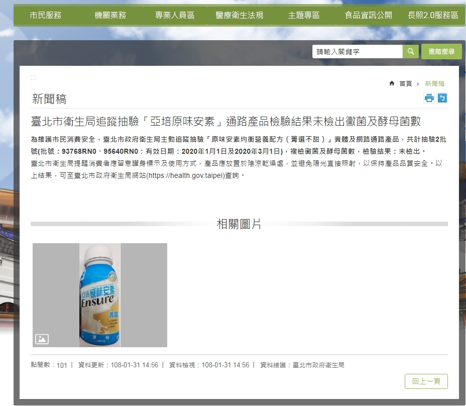 今天衛生局發布檢驗報告,抽驗「原味安素均衡營養配方(菁選不甜)」實體及網路通路產品,共計抽驗批號93768RN0及95640RN0,皆未檢出黴菌及酵母菌。