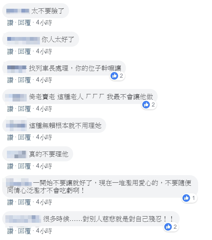 他的悲慘遭遇也讓網友紛紛同情表示:「都花錢了,當然坐下去」、「請列車長處理,根本不用理她」、「倚老賣老真的很討厭,請列車長處理」、「別當濫好人啊」、「不需要讓,也不需要怕被白眼,她裝可憐,你可以裝的比他可憐,看誰丟臉」、「自己的位置為何要讓?旁邊的人如果白眼或說話,那就請旁邊的人讓座啊!」、「不想站就買坐票!少在那倚老賣老的,明明可以很公平的事情就是會被這些人弄到不公平。」