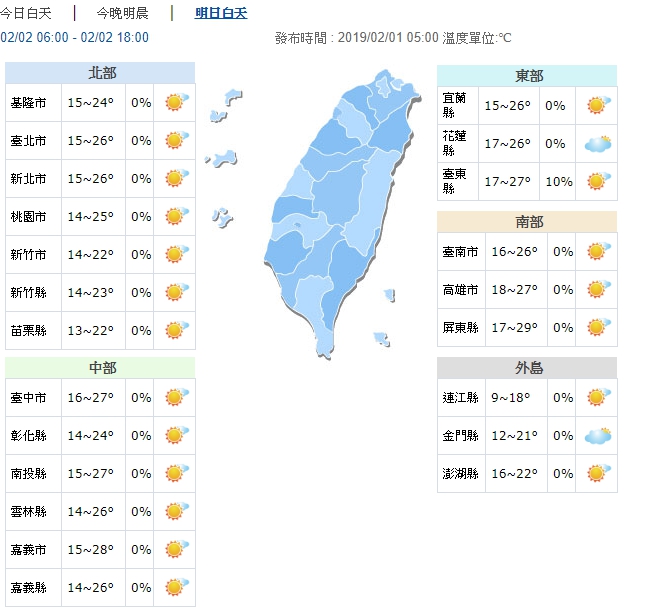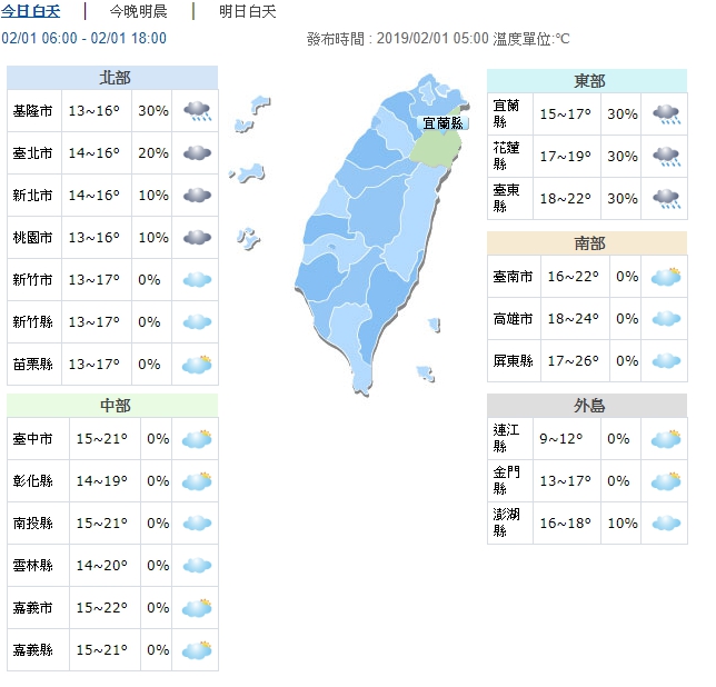 氣象局指出,1日受到大陸冷氣團影響,北台灣一整天偏涼冷,高溫僅16至17度,中部及花東地區約19至22度,南部影響則不大,仍可到26度的高溫,不過,民眾須留意入夜後的氣溫,西半部及宜蘭地區低溫約15至17度,花東地區為19度左右,提醒民眾適時增添衣物保暖。另外,在天氣方面,大台北及東半部地區有局部短暫雨,北部其餘地區雲量稍多,有小飄雨的機率,中南部地區為多雲。