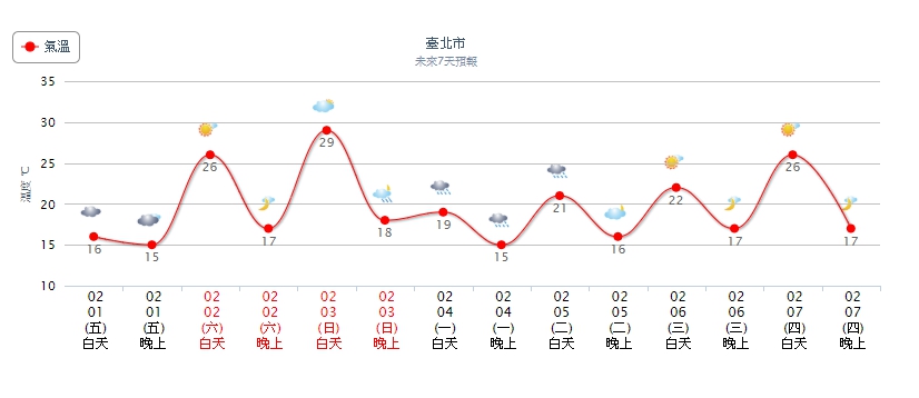 受到大陸冷氣團影響,今(1)日天氣轉為涼冷,各地高溫明顯下降,與昨(1月31日)相比,落差高達10度,北部平均高溫約17度,民眾須注意保暖。明(2)日是春節連假首日,未來天氣將呈現每2天就變天,冷暖交替的型態。