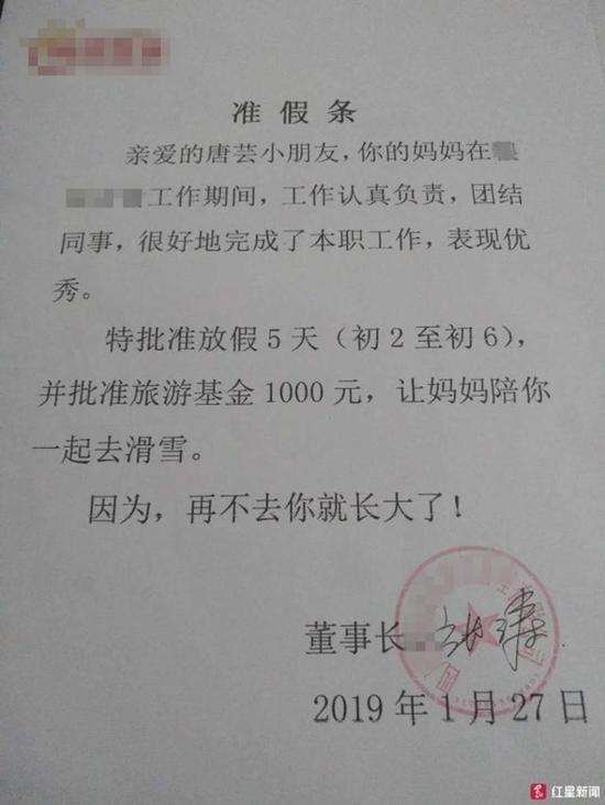 准假條上寫著:「親愛的唐芸小朋友,你的媽媽在工作期間,工作認真負責,團結同事,很好地完成了本職工作,表現優秀。特批准放假5天(初2至初6),並批准旅遊基金1000元(人民幣,約台幣4500元),讓媽媽陪你去滑雪。因為,再不去妳就長大了!」