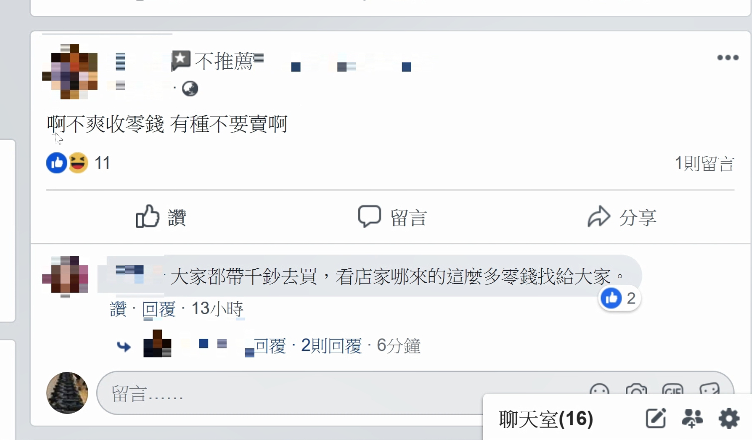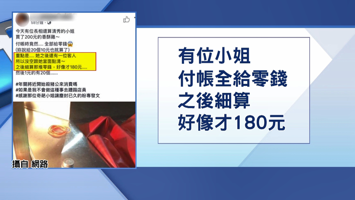 店員在公開社團PO文說:「客人來買香酥雞全部給零錢,要我拿20個10元,買200元的東西,我也會很不好意思,大家去買東西,會這樣糟蹋店員嗎?」