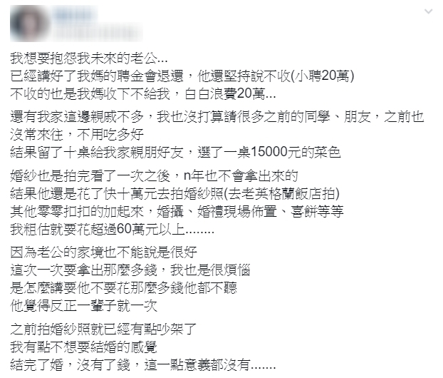 原Po也提到,她認為婚紗拍完一次就再也不會拿出來看,不如將錢省下來,沒想到未婚夫依然砸了將近10萬拍婚紗照,再加上婚禮攝影、婚禮現場佈置、喜餅等等,粗估就要花超過60萬元以上,這讓原Po百思不得其解,因為未婚夫家境也算不上「很好」,一次要拿出這麼多錢會造成不小負擔,但對方講不聽,只是不斷安撫她「一輩子就一次」,認為這些錢花得很值得。