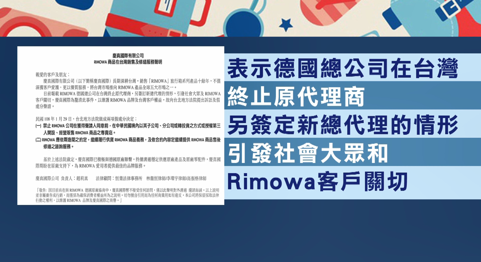 表示德國總公司在台灣終止原代理商,另簽定新總代理的情形,引發社會大眾和Rimowa客戶關切,為了釐清整件事以及維護消費者權益和品牌價值,因此向台北地方法院,申請假處分和訴訟。