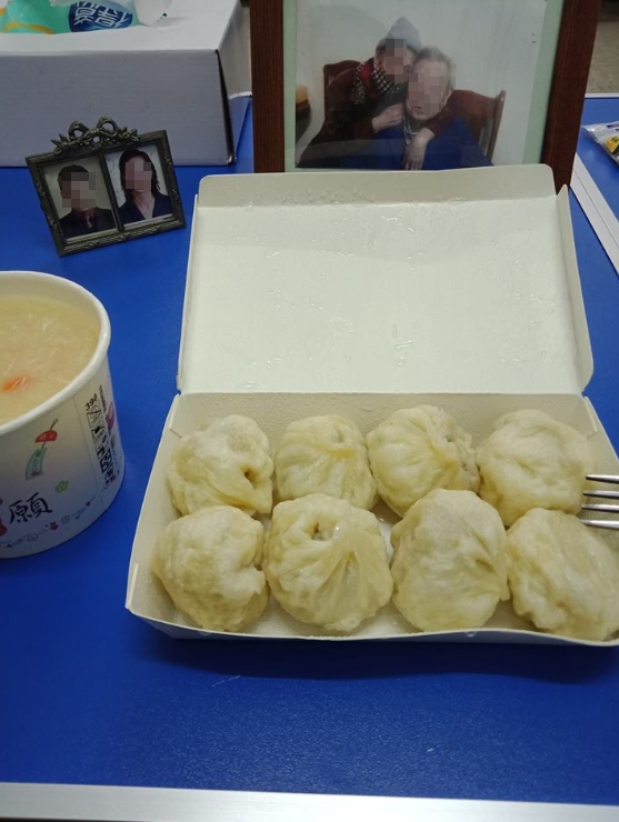 藍色的桌上,只見一盒裝有8顆小籠包和1碗熱騰騰的玉米濃湯,原PO準備大快朵頤,與長輩一起吃團圓飯,她透露,自己是獨女,父母親在她小時候就過世了,是外公外婆一手拉拔長大,無奈6年前天倫夢碎,兩老們相繼離世。