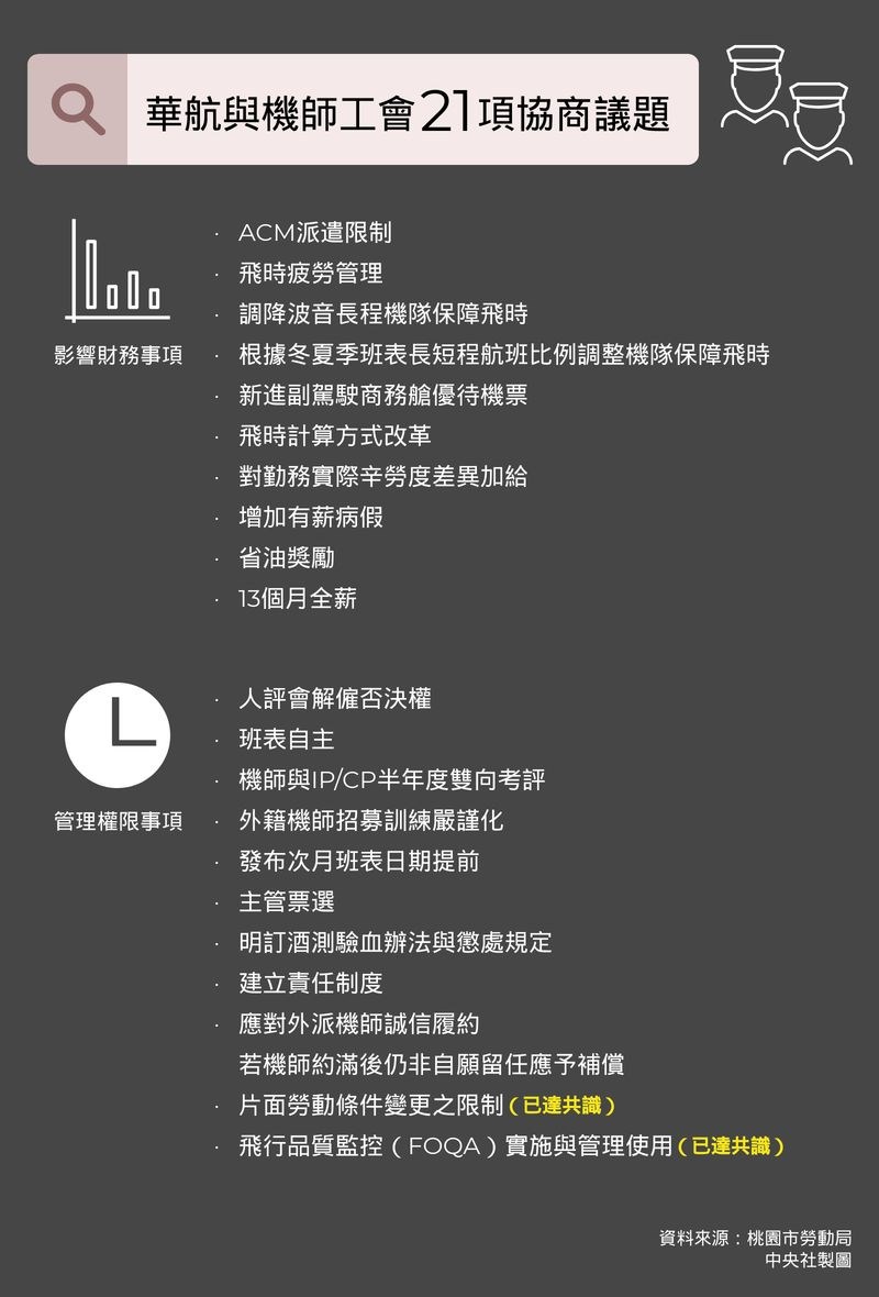 桃園市機師職業工會華航分會今天清晨宣布6時起罷工,回顧機師工會與華航勞資爭議,桃園市機師職業工會在去年8月投票取得合法罷工權,根據桃園市勞動局資料,勞資協議一共有21項訴求,其中包含片面勞動條件變更之限制、飛行品質監控(FOQA)實施與管理使用2項訴求在去年已達成協議,機師工會去年同意暫緩罷工一年,繼續協商剩下19項訴求。