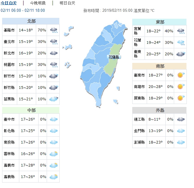 農曆春節假期結束了,今(11日)是開工日,但天氣卻不美麗!持續受到東北季風影響,北部及東半部天氣陰涼,且出現局部短暫雨,上午降雨範圍主要分布在新竹以北,包括基隆北海岸一帶,下半天宜蘭、花蓮及台東的降雨機率也會提高,提醒民眾外出準備雨傘,至於中南部影響則不大,整天維持多雲到晴的好天氣。