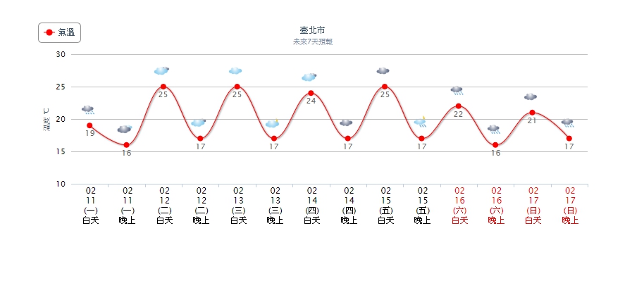 氣象局預報,12日到14日因東北季風稍減弱,氣溫明顯回暖,全台天氣算穩定晴朗,北部高溫上看25度,中南部更可以來到30度,但清晨仍偏涼,西半部日夜溫差大。另外,12日至14日水氣不多,只有東半部地區及北部山區有局部短暫雨,其他地區為多雲到晴。值得注意的是,16、17日有另一波東北季風報到,北部及東北部氣溫會跟著下降,其他地區早晚亦涼,北東部雲量增多,開始出現短暫雨。