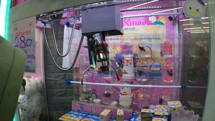 投下10元硬幣,操控搖桿,夾取想要的物品,但仔細看這娃娃機裡,除了盒裝玩具外,後頭還放著一隻隻魚兒,算一算總共有12隻。