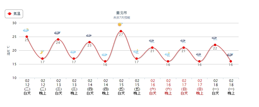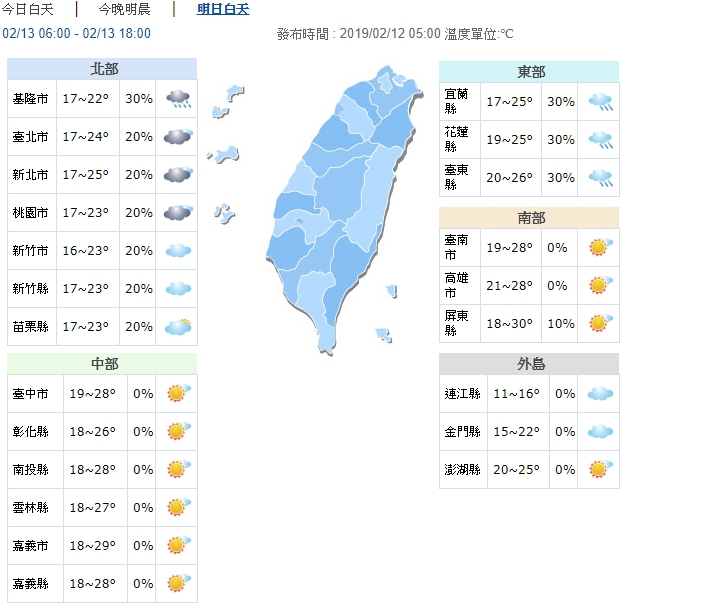 中央氣象局指出,12日北部地區雲量減少,因此白天與昨天相比氣溫明顯回升,各地多雲到晴,北部、東部約24、25度,中南部更可達28至30度上下,但早晚仍涼,清晨中部以北及東北部低溫約15至17度,南部及花東約18至20度,西半部日夜溫差大,提醒民眾留意溫度變化。另外,隨著台灣附近風場由東北風轉為偏東風,北部地區降雨逐漸減少,不過,迎風面的基隆北海岸、大台北山區及東半部地區仍有局部短暫雨,其中宜蘭地區並有局部較大雨勢發生的機率,請留意。