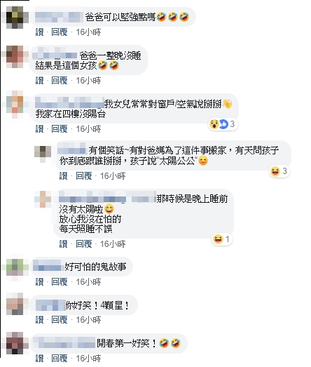 女孩身份神反轉,讓其他網友看完後全捧腹大笑,「內心小劇場爆炸」、「害爸爸挫了一整晚」、「爸爸差點嚇尿」、「爸爸可以堅強點嗎」、「本來很驚悚的變得超噴淚的」、「爸爸被拐了」、「老爸的心跳指數破表」、「自己演很大」。此外,也釣出不少苦主,紛紛回應:「我女兒常常對窗戶、空氣說掰掰,我家在4樓沒陽台」、「我也是常常被我女兒嚇壞」、「我兒子總是比天花板某個位置說頭、頭、頭」。