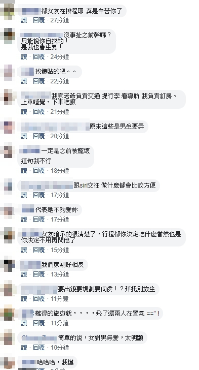 公主女友的訴苦文一出,讓臉書《爆怨公社》的網友也看不下去,紛紛急勸放生「不懂互相就放生吧!或許改天她會找到適合她的,這樣的關係很難長久,不必委屈自己吧?」、「我覺得沒共識很難相處,還是各自尋找幸福吧!」、「拜託不要放公主出來危害世間,阿彌陀佛」、「你可以繼續玩啊,叫女生自己回台北」、「為了小事情翻臉、冷戰,這種伴真的很累!放生算了!」、「還好你們在台灣玩,如果出國玩就呵呵了」、「一定是之前被寵壞,這句我不行」。