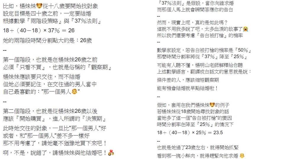 ▼以「兩階段策略」與「37%法則」即可算出自己該在什麼時候選定另一半。(圖/翻攝自楊明山老師臉書)