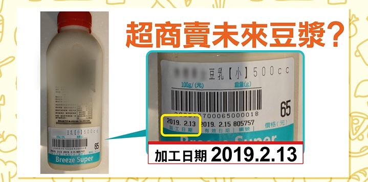 高單價著名的微風超市竟然出現未來豆漿,有民眾看到一瓶打了折扣的豆漿,原以為是即期品,仔細一看卻發現製造日期竟然是3天後,讓他覺得很誇張。衛生局獲報後,趕緊派人前往調查,如果真的是標示不實,將會依法開罰最高四百萬罰鍰。