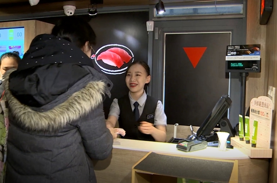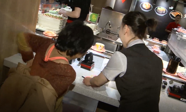 迴轉壽司店店員:「歡迎光臨先生、小姐幾位,2位我們這邊請。」