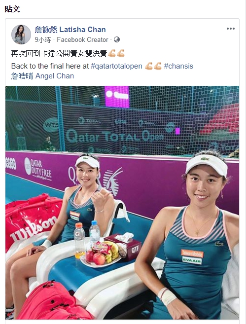 台灣網球雙打姊妹花詹詠然與詹皓晴這次在杜哈女網賽面對前兩輪對手,皆以直落二橫掃,今天在4強賽儘管陷入苦戰,但連續2盤都後來居上,最終以6比4、7比6(2)搶下決賽門票。