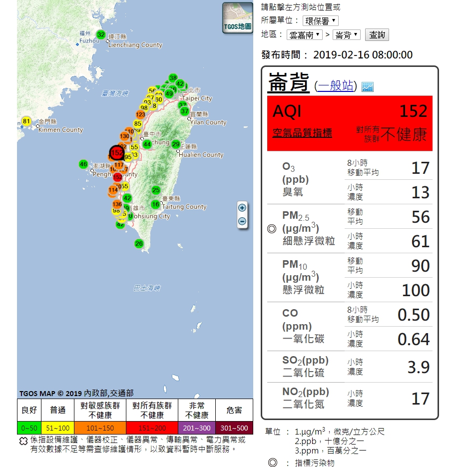 宜蘭、花東空品區及澎湖為「良好」等級;北部、竹苗、中部空品區及金門、馬祖地區為「普通」等級;雲嘉南、高屏空品區為「橘色提醒」等級,高屏地區位在下風處,擴散條件稍差,短時間局部區域為「紅色警示」等級;詳查環保署網站