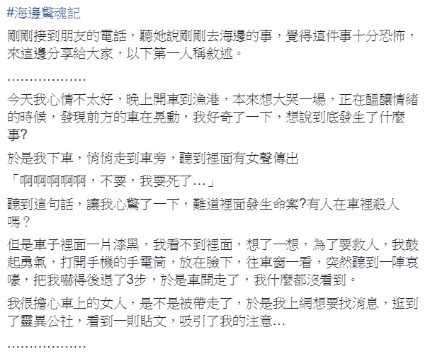 沒想到文章PO出不久,一名女網友就在留言處怒譙「X,什麼女鬼,那是我啦!」嚇得男子馬上刪文,女網友則無奈解釋,當天晚上心情不好到漁港散心,原本想大哭一場發洩壓抑已久的情緒,結果醞釀情緒到一半,發現前方的車子異常激烈晃動,在好奇心驅使下上前查看,沒想到車內傳出女子的哀號「啊啊啊啊啊,不要,我要死了…」,擔心發生命案,趕緊開啟手機的手電筒,將臉貼到車窗上查看,怎料車內竟傳出更淒厲的叫聲,把她嚇得往後跳,車子也隨即開走,事後仍相當擔心車內的女子,沒想到看見自己被說成恐怖女鬼,內心一把無名火油然而生,氣得大吼「以後再也不要那麼好心了!」
