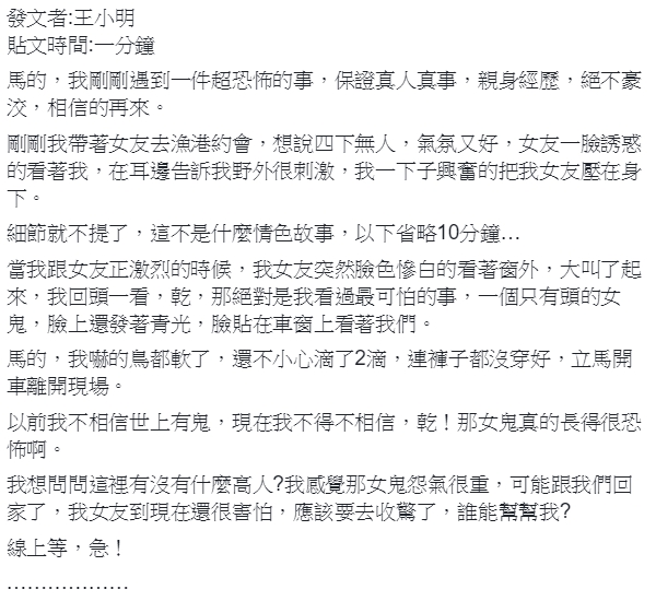 男子在臉書《靈異公社》驚恐PO文,表示當時燈光昏暗,女友又一臉誘惑的看著他,嬌嗔「野外很刺激」,讓他精蟲衝腦,馬上撲倒女友啪啪啪,結果倆人正激烈時,女友卻臉色慘白的望著窗外,驚恐尖叫,他困惑地抬頭一看,「X!那絕對是我看過最可怕的事,一個只有頭的女鬼,臉上還發著青光,臉貼在車窗上看著我們!」驚悚的畫面讓他瞬間嚇到軟掉,顧不得褲子還沒穿好,馬上爬回駕駛座開車離開現場,回家後仍驚魂未定,直說女鬼怨氣很重,長得很恐怖,只好求助網友「我女友到現在還很害怕,應該要去收驚了,誰能幫幫我?」