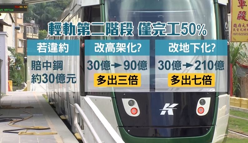 輕軌第二階段僅完工50%,如果不再蓋,市府就算違約,要賠統包商中鋼約30億元,如果傾向高架化或地下化經費更是驚人,高架化將多出三倍經費,從30億變成90億,地下化更不用談,硬生生多出七倍經費高達210億。