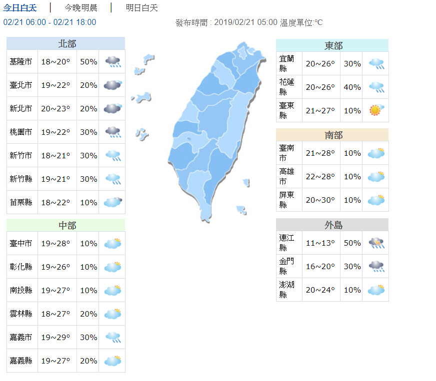 根據中央氣象局,今(21)日白天鋒面在台灣北部海面,台灣北部、東半部地區及金門、馬祖有局部短暫陣雨,中南部地區亦有零星短暫陣雨,澎湖為多雲的天氣,高溫約22、23度,中南部約29、30度,宜花東地區約26、27度晚上至明(22)日鋒面通過及大陸冷氣團南下,北部及東北部天氣轉冷,北部、東北部及金、馬有短暫陣雨或雷雨發生,並有局部較大雨勢發生的機率,東部及東南部地區也可能有局部短暫陣雨。