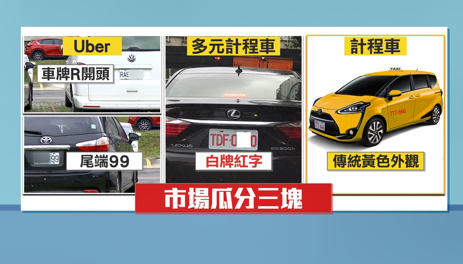 要分辨也很簡單,如果是Uber,車牌應該是R開頭或者尾數是99,但在路上看到白牌紅字的車,則是多元計程車,再加上原有的小黃,市場大餅被瓜分成3大塊。